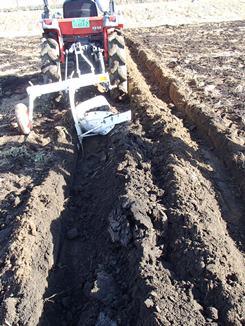 トラクターに付けた鋤で土を反転させます。