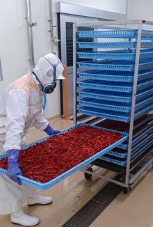 脱水後、乾燥用トレーに広げて、乾燥機に入れて仕上げ乾燥させます。