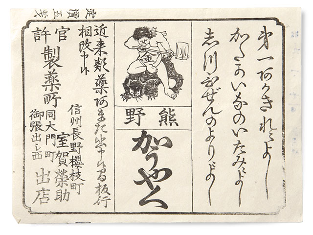 この膏薬を八幡屋礒五郎では《官許製薬所室賀榮助》として、《七味唐からし》とともに代々売っていました。その名も《熊のかうやく》といいます。名前からして熊の何かが入っていそうですが、実際には松ヤニと胡麻油を煉ったもの。